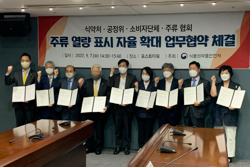 [▲ 사진 설명 : (왼쪽부터) 한국수제맥주협회 박정진 회장, 한국막걸리협회 정규성 회장, 한국주류안전협회 문세희 회장, 대한탁약주제조중앙회 이동수 회장, 식약처 권오상 차장, 한국...
